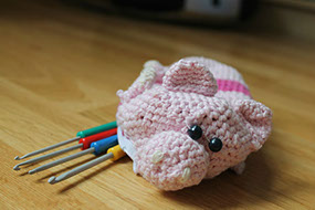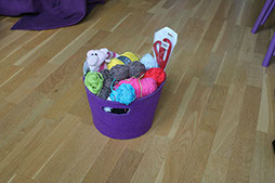 I denna lilla korg förvarar jag mina virksaker, virkgarn och olika monteringsredskap.